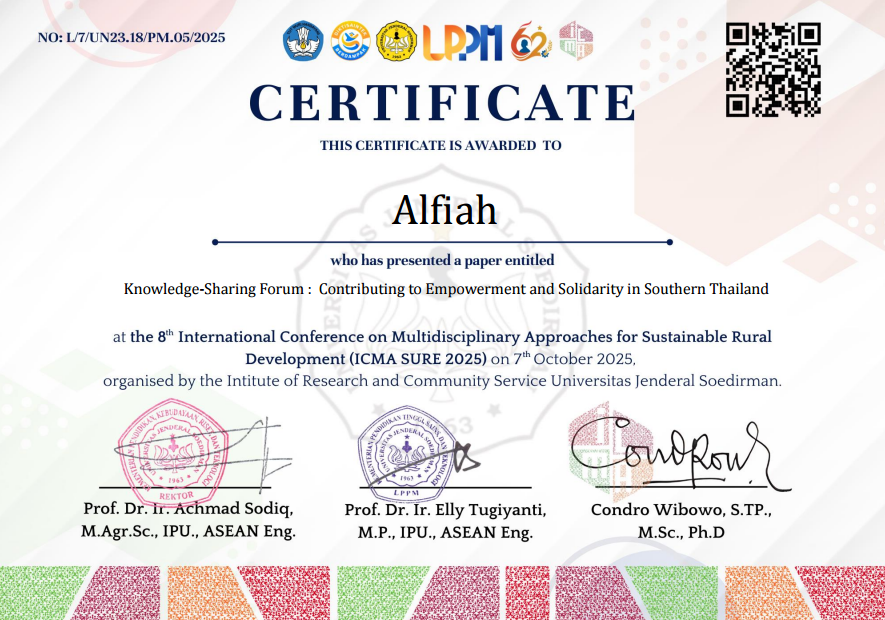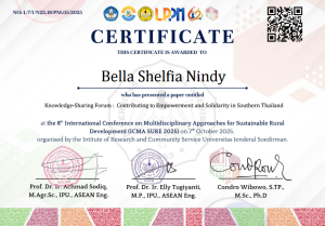 ICMA SURE diselenggarakan oleh LPPM Unsoed pada hari Selasa, 7 Oktober 2025, melalui zoom meeting, dengan tema “Sustainable Digital Transformation : Integrating Local Values in Downstream Development”. Tim yang diketuai Prof. Dr. Sofa Marwah, M.Si memaparkan materi mengenai “Knowledge-Sharing Forum : Contributing to Empowerment and Solidarity in Southern Thailand”, berdasarkan kegiatan yang dilakukan oleh tim pada PKM internasional bulan Agustus di Provinsi Narathiwat dan Pattani, Thailand, dengan mitra PERSAIT dan LPPM Unsoed.